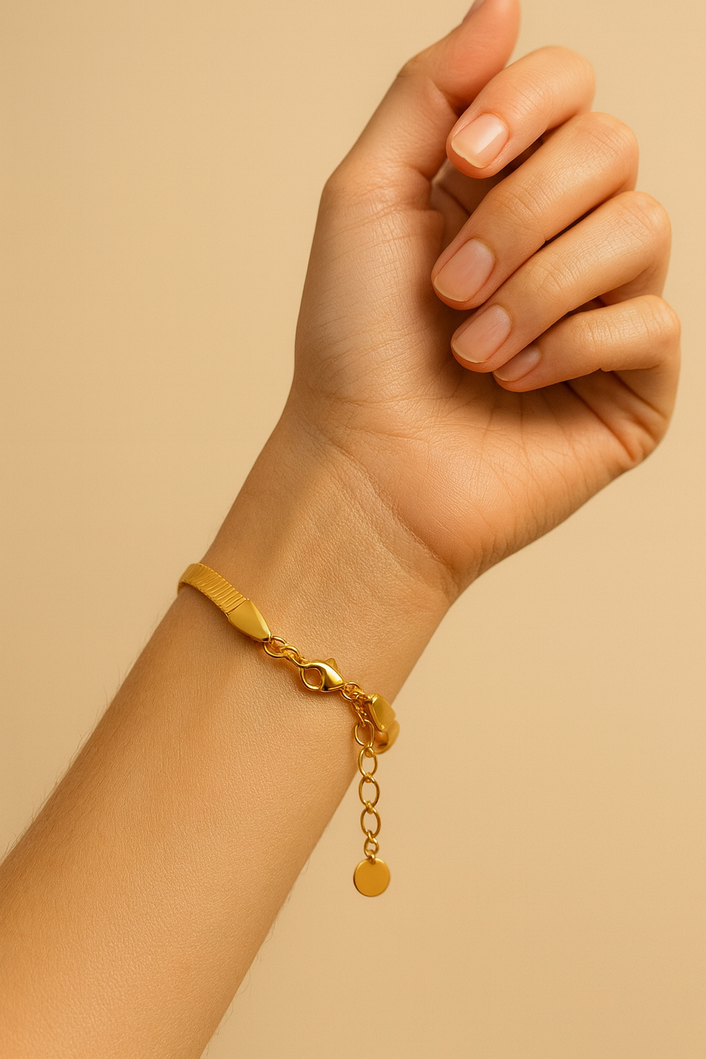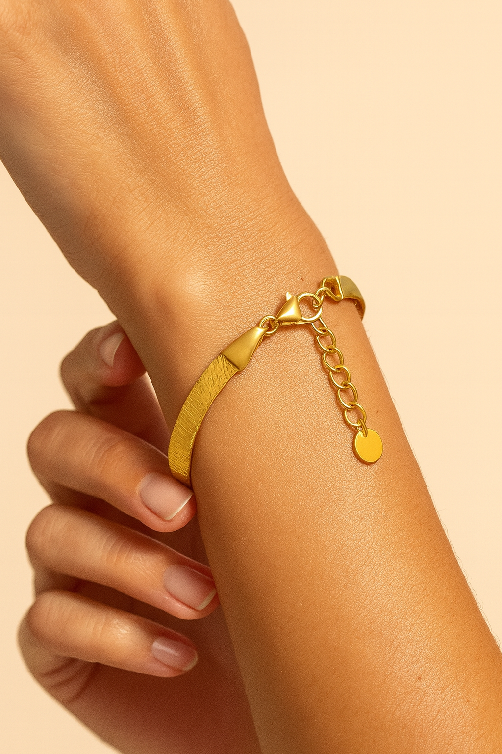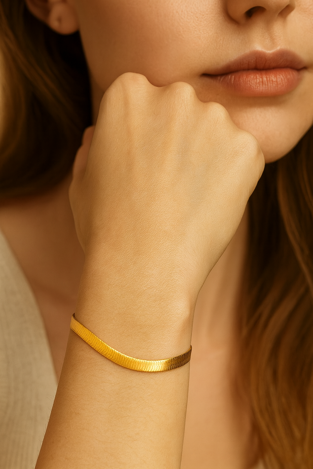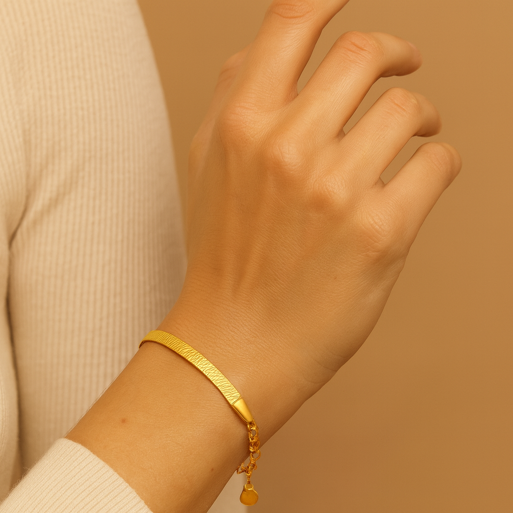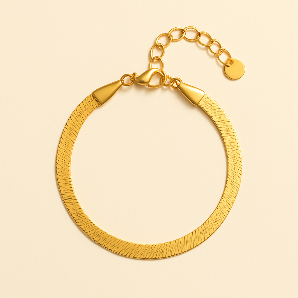 The Auri bracelet captures the essence of radiant simplicity. Designed in a refined herringbone silhouette, each link flows seamlessly like molten gold, smooth, fluid, and luminous under every angle of light. Its delicate yet substantial form embodies modern minimalism with a whisper of timeless allure. Worn alone, Auri is a quiet statement; layered, it becomes pure sophistication. Hand-finished in rich 18k gold tone with a secure adjustable clasp, this piece reflects Cristl’s philosophy.