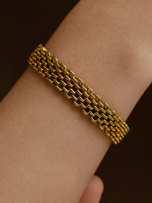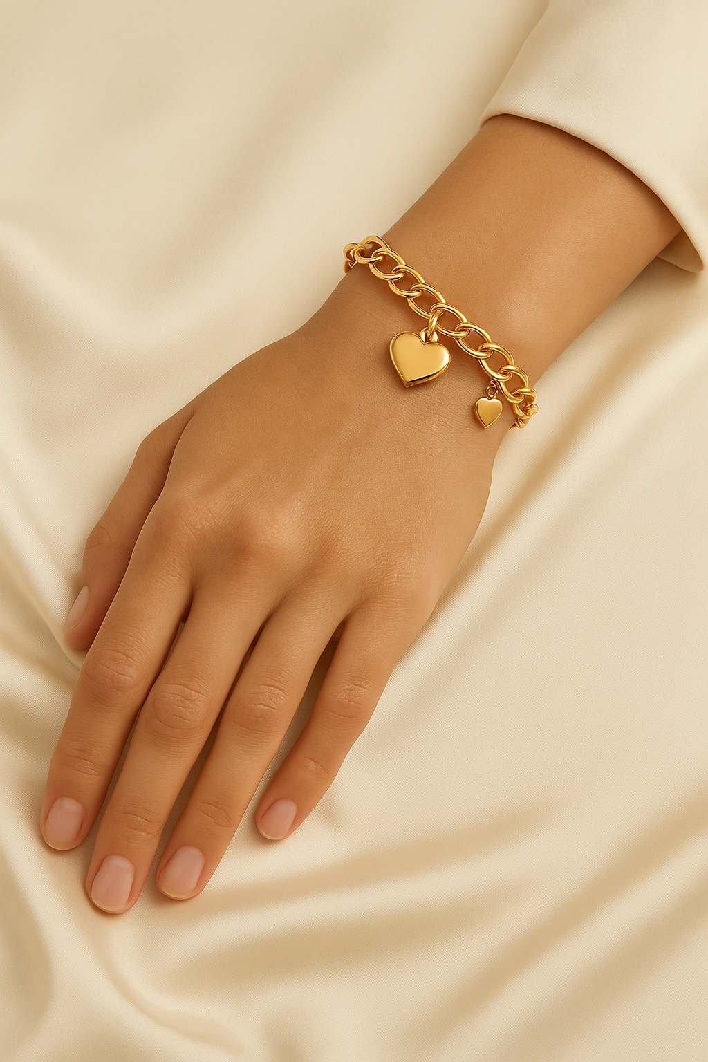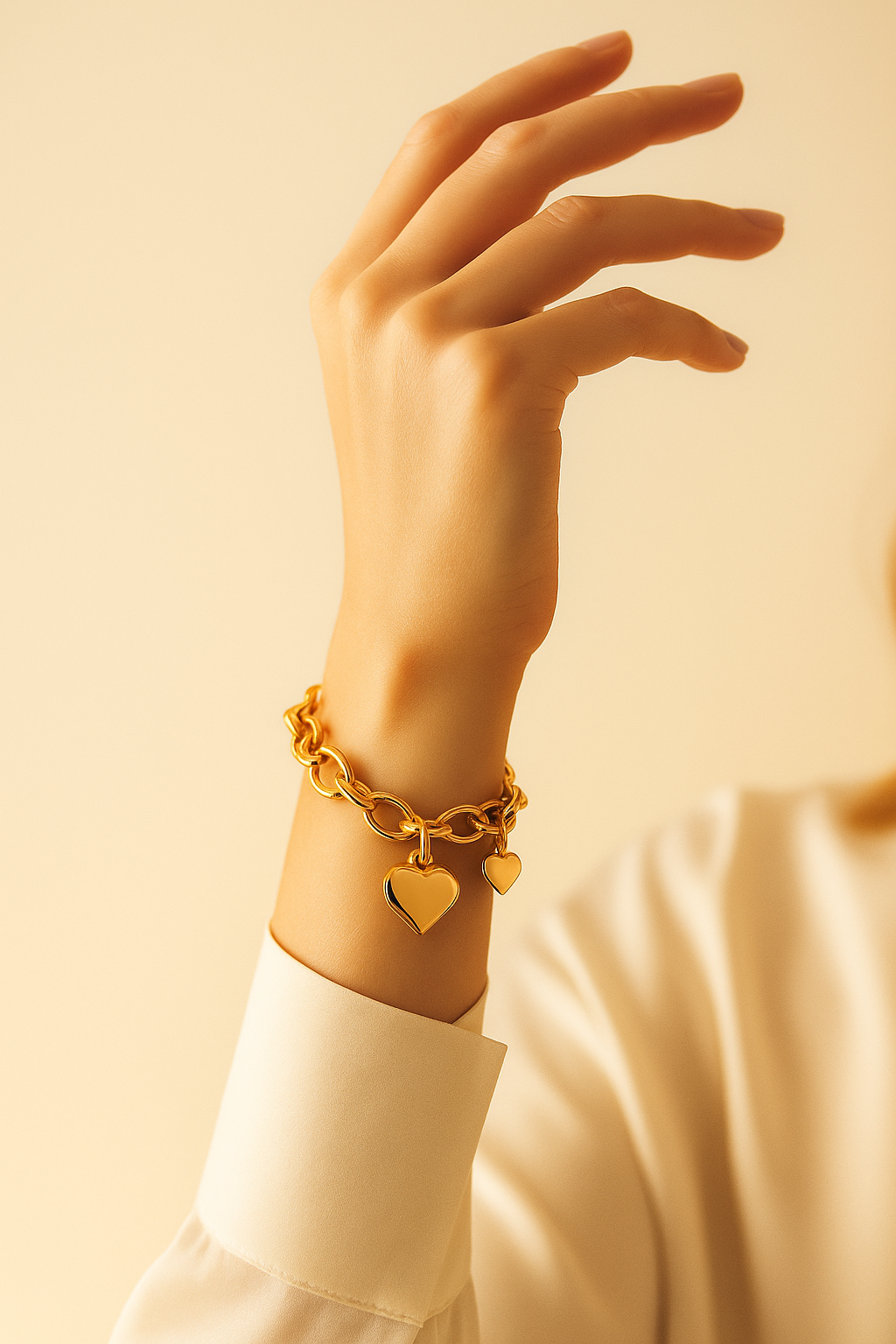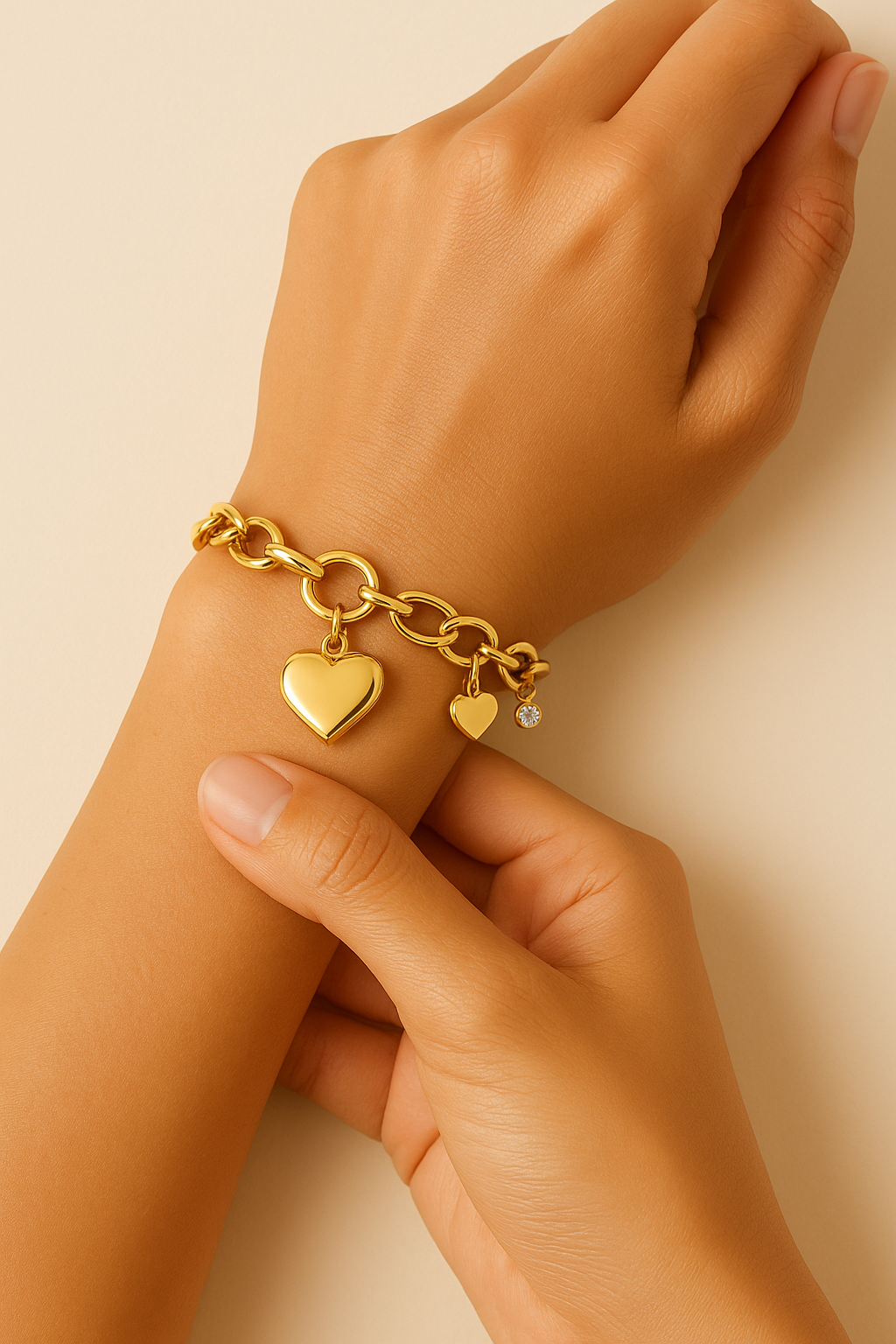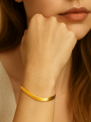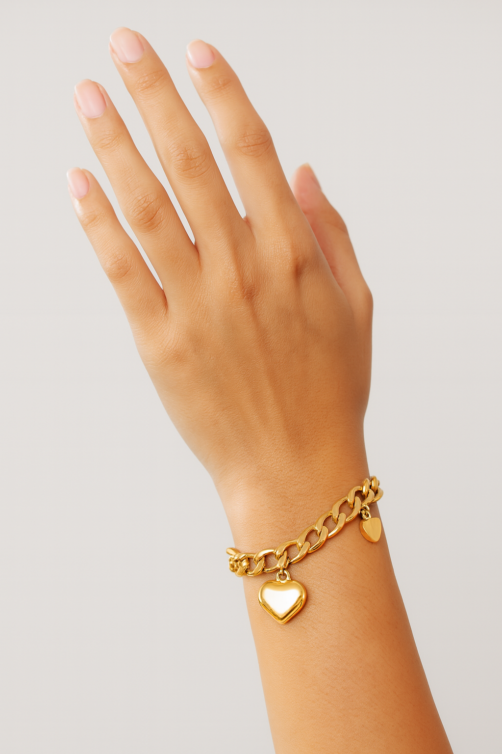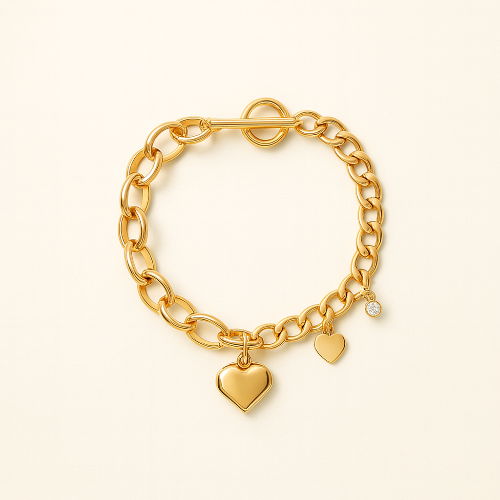 A symbol of lasting grace, the Éterna bracelet captures the poetry of timeless love. Sculpted in luminous 18K gold plating, each link flows seamlessly into the next. Refined, fluid, and eternal. A delicate heart charm rests at its center, whispering of devotion and quiet strength, while a petite crystal spark catches the light like a memory held close.