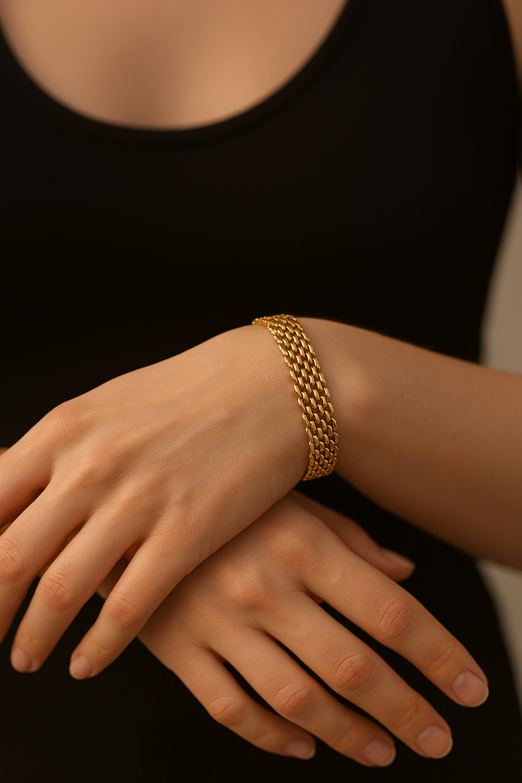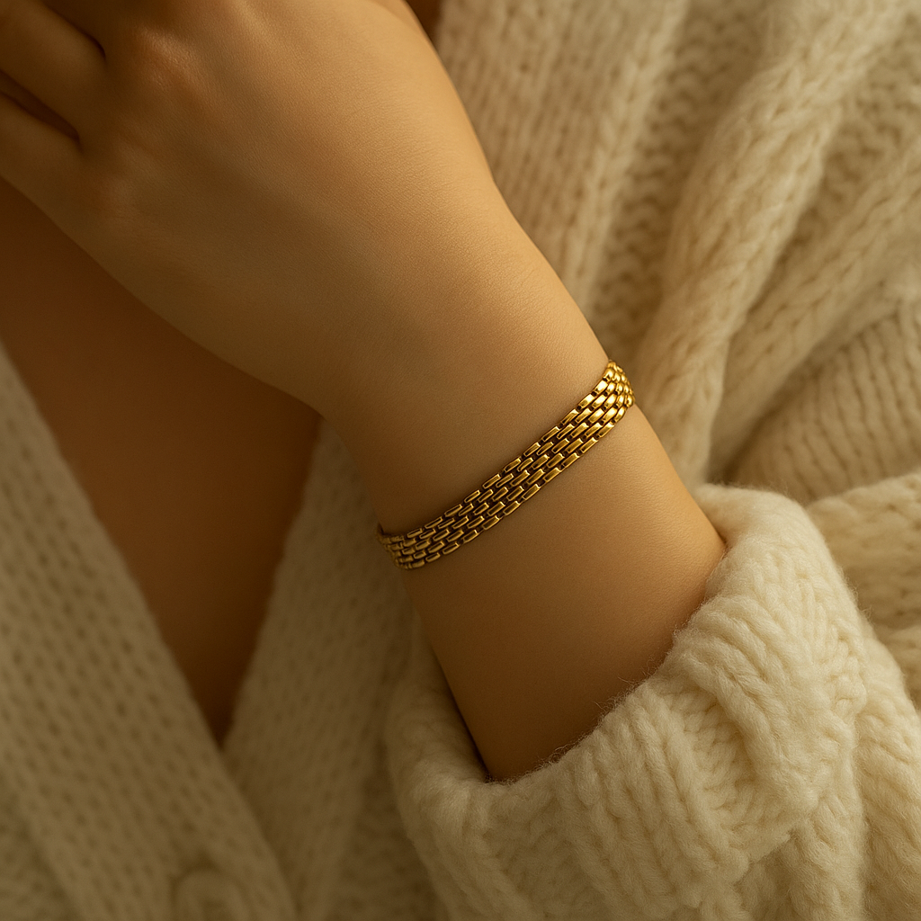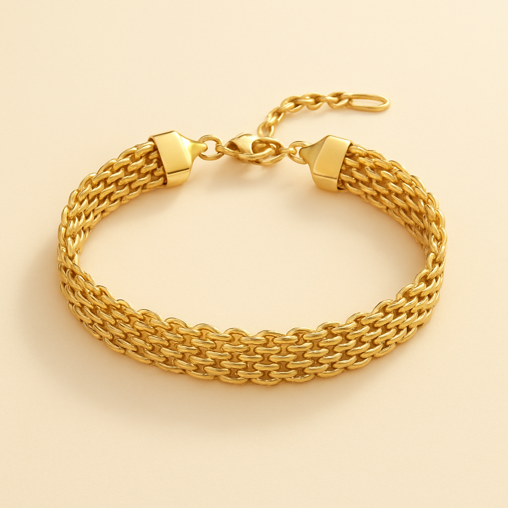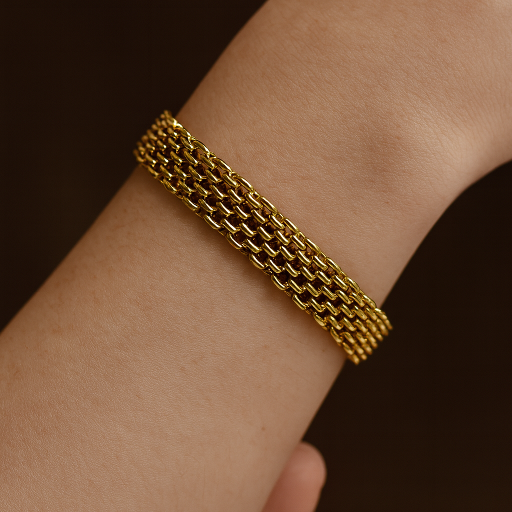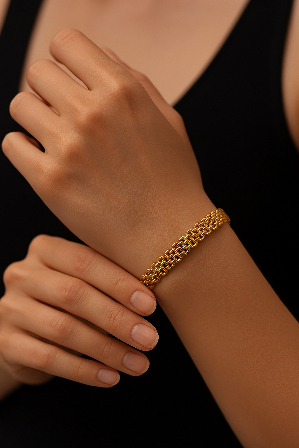Refined and radiant, the Orelle bracelet captures the essence of modern elegance in its purest form. Crafted in soft 18K champagne gold tones, each interwoven link gleams with understated brilliance. A quiet statement of sophistication. The design’s fluid curvature and warm ivory reflections evoke the timeless poise of Parisian luxury. Delicate yet confident, Orelle was made for the woman who shines without trying. Effortless, graceful, and endlessly golden.