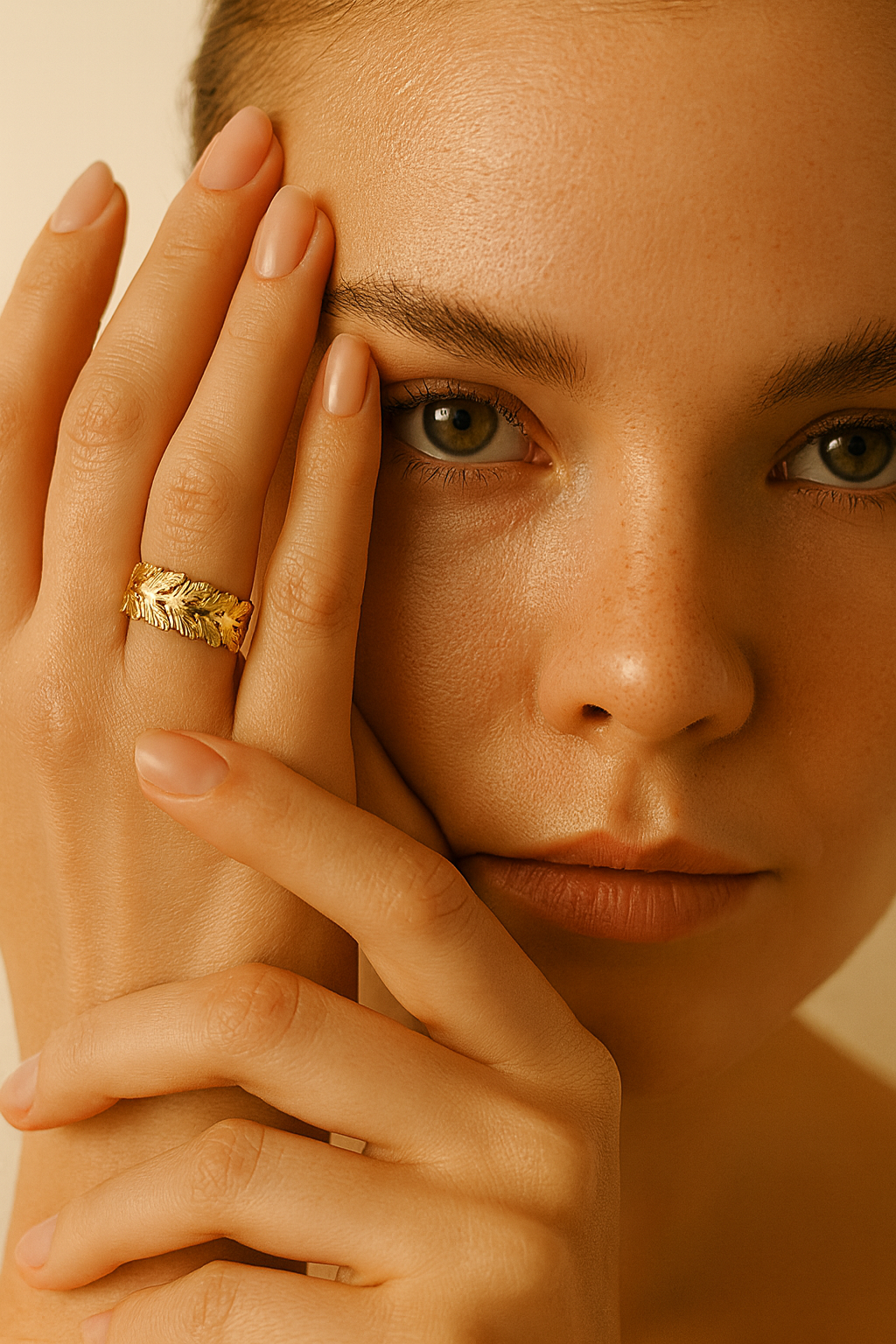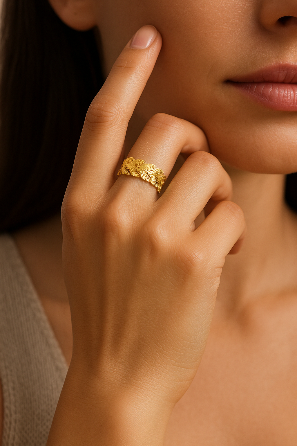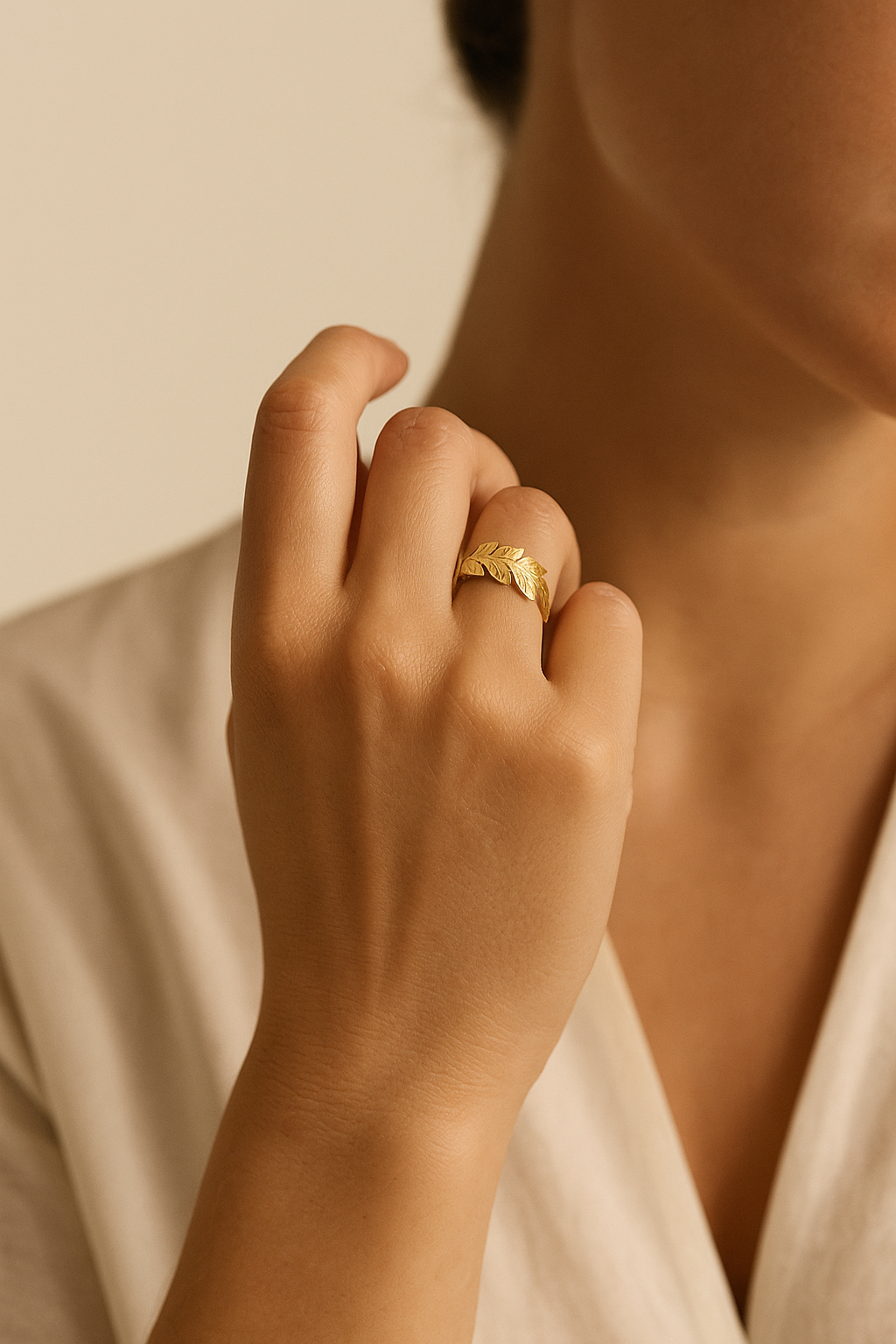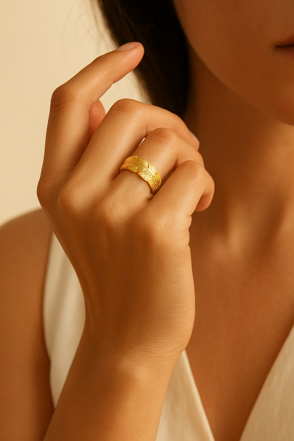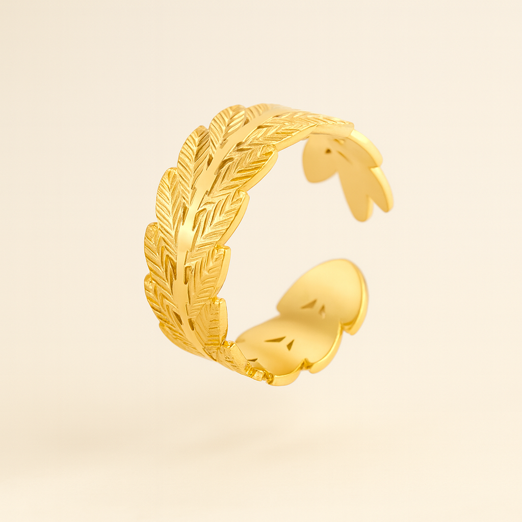 The Orlane ring embodies the quiet luxury of modern elegance. Its sculpted laurel-leaf design wraps gently around the finger, finished in radiant 18K gold plating over premium stainless steel. Adjustable for a perfect fit, Orlane is designed to move with you. Light, refined, and timeless. Each curve reflects the warmth of soft golden light, making it the perfect statement of everyday sophistication.