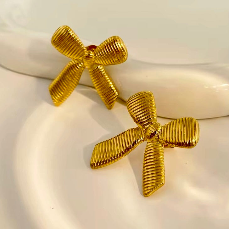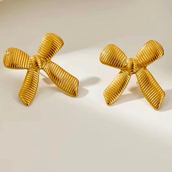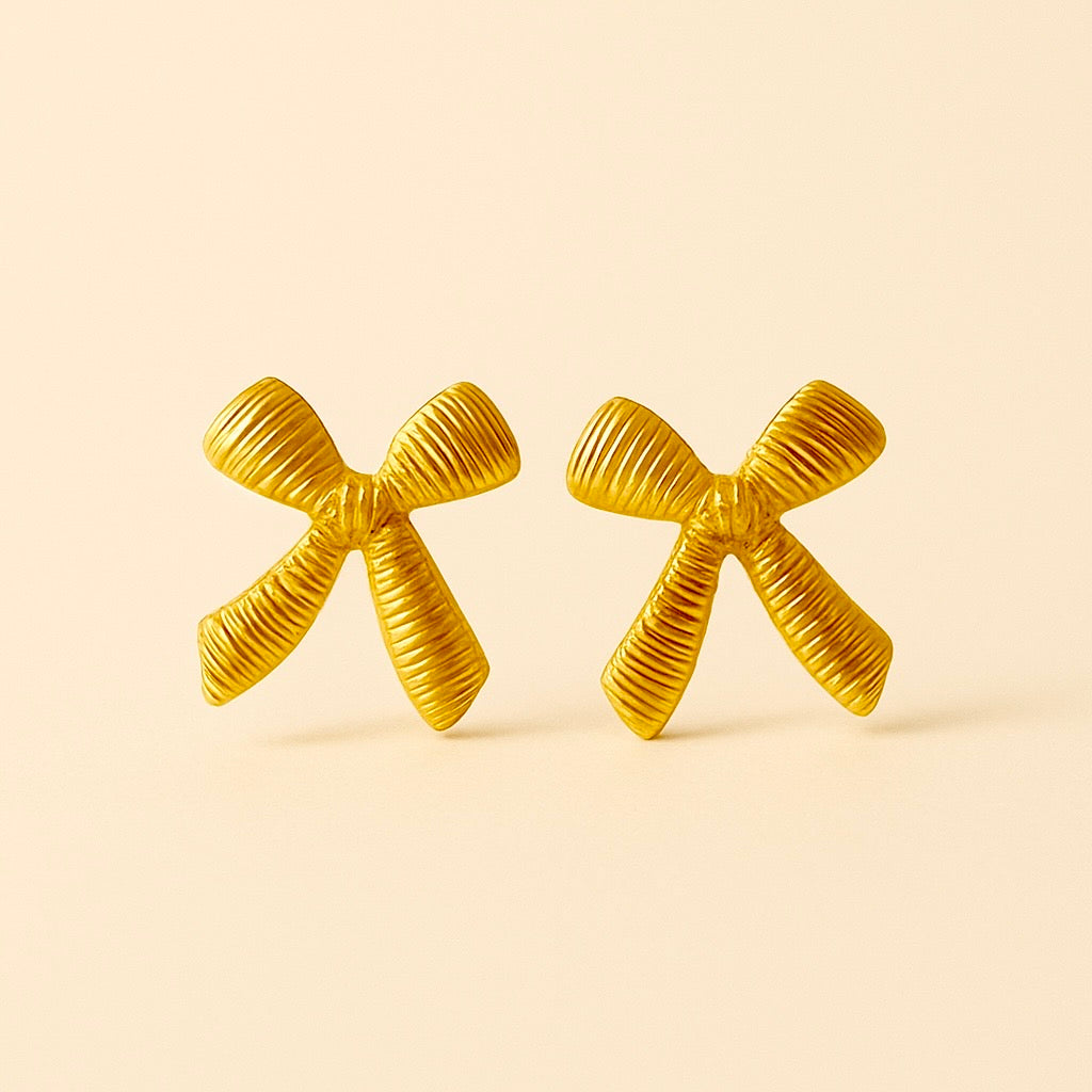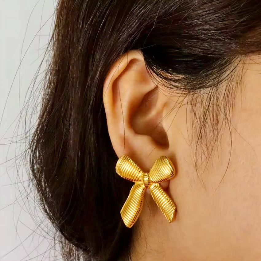 The Rosette earrings bloom with quiet grace. Crafted in 18k gold-plated stainless steel, each delicate bow unfurls in soft light, capturing the art of timeless femininity.